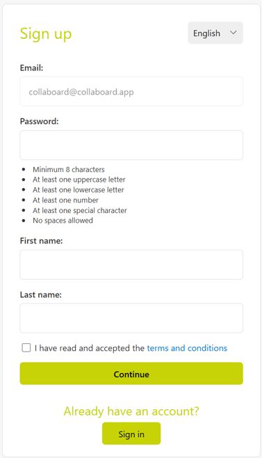 In Collaboard you have several options to create an account. You can register an account using your email address or use your Google, M365 or Apple account. Alternatively your organization can setup Single Sign-On.