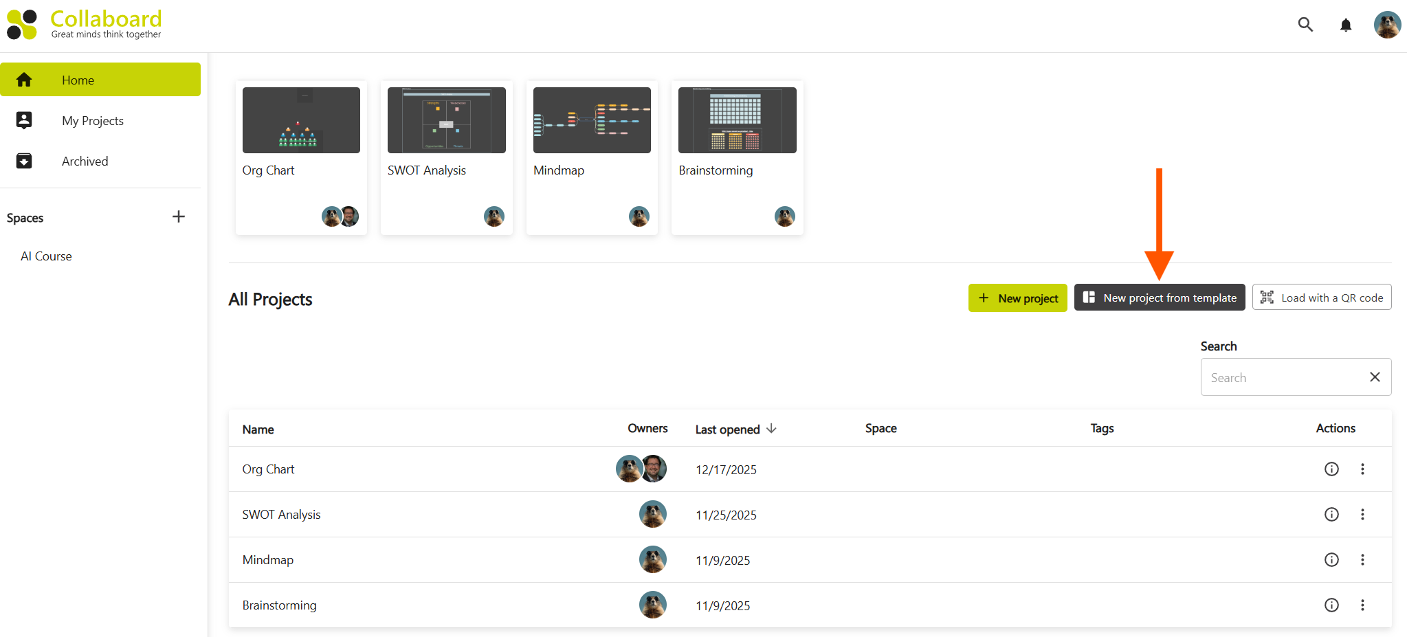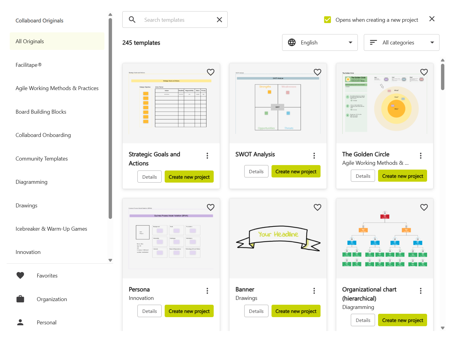 You can choose from the "Collaboard Originals" the official template library from Collaboard. If you have personal templates or templates from your organizations, you can create a new project using one of these.