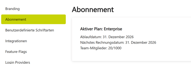 Hier wird angezeigt, welches Abonnement aktuell aktiv ist (z. B. Enterprise, Business oder Basic).