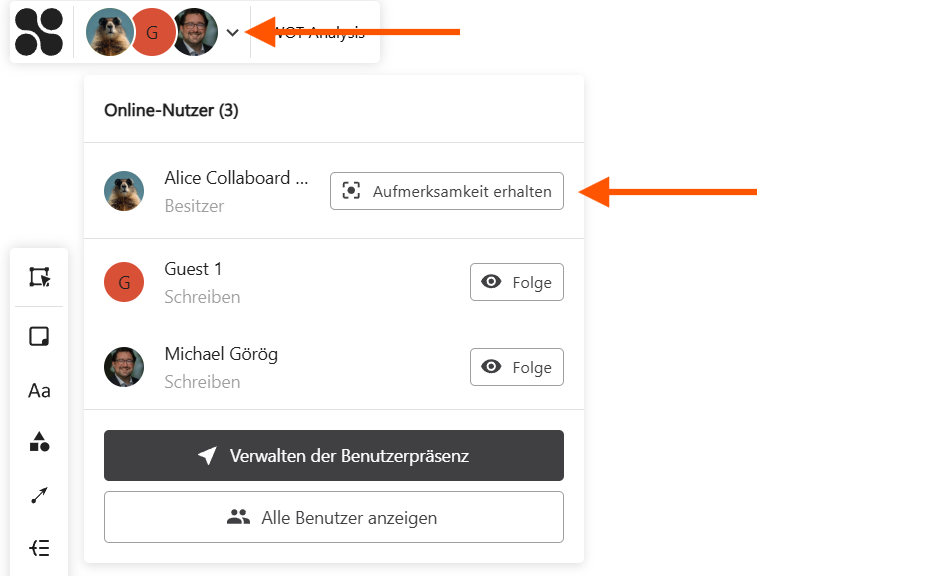 Mit der Funktion „Aufmerksamkeit erhalten“ kannst Du als Moderator alle Teilnehmenden auf dem Whiteboard gezielt auf Deine Ansicht führen. Das ist besonders hilfreich bei Präsentationen, Workshops oder Moderationen, wenn alle denselben Bereich des Boards sehen sollen.