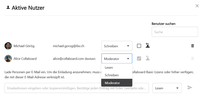 Collaboard arbeitet mit drei Ebenen von Berechtigungen: