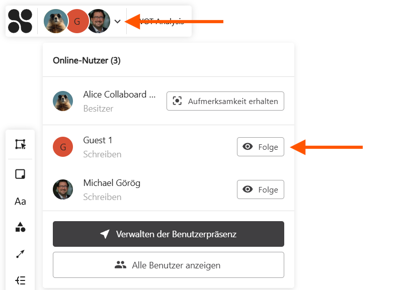 Mit der Funktion „Folgen“ kannst Du die Ansicht eines anderen Nutzers auf dem Whiteboard übernehmen und seine Navigation in Echtzeit mitverfolgen. Das ist besonders hilfreich bei Präsentationen, Workshops oder wenn Dir jemand etwas direkt auf dem Board zeigen möchte.