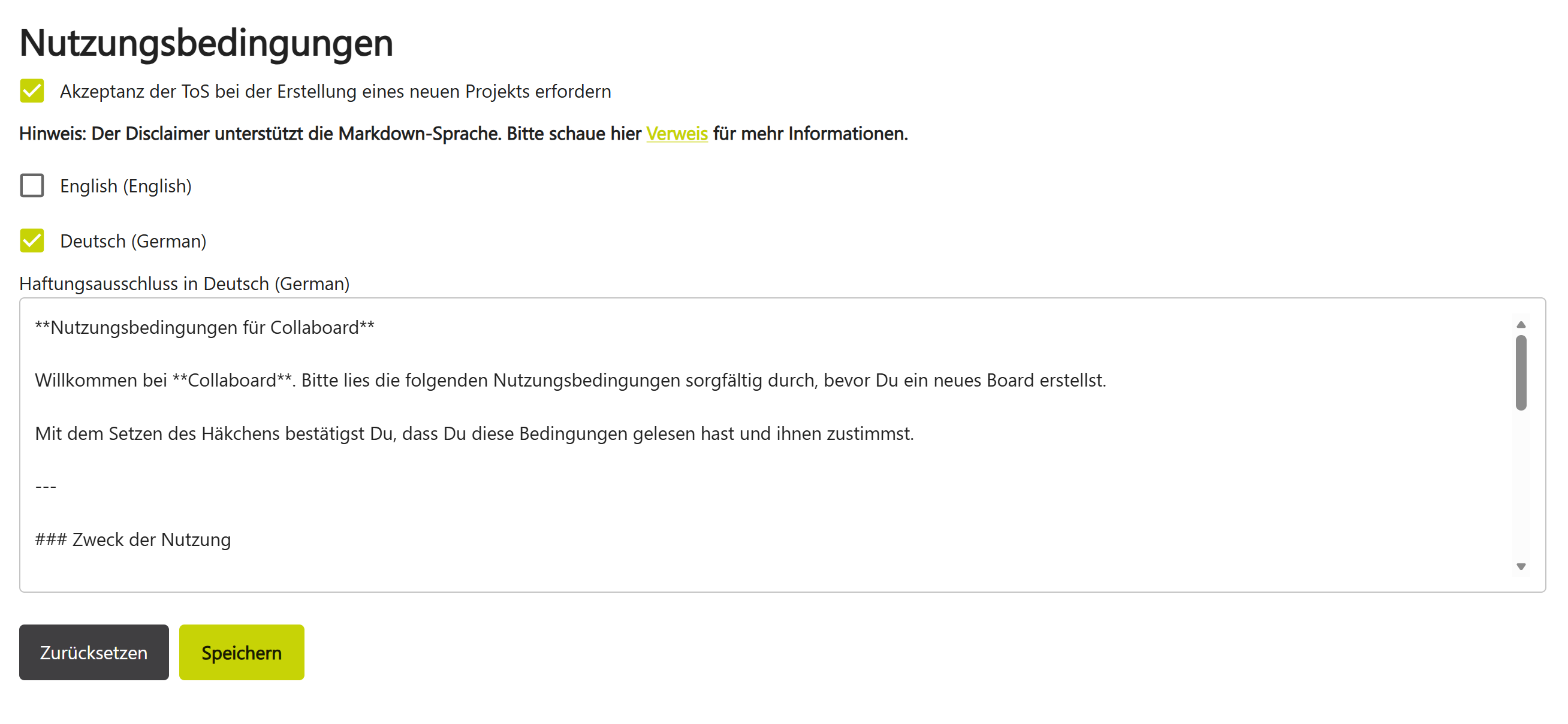 Die Texte der Nutzungsbedingungen unterstützen Markdown. Damit kannst Du Inhalte strukturiert und übersichtlich formatieren.