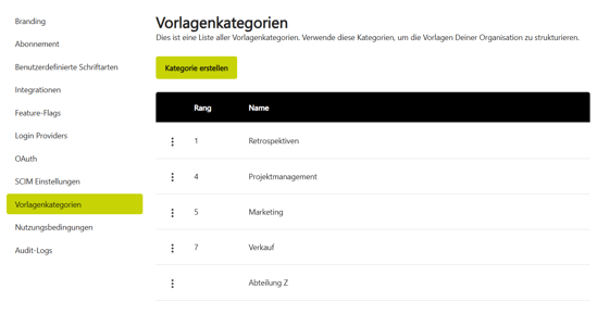 Damit Du Organisationsvorlagen erstellen kannst, müssen zuerst Kategorien angelegt werden.