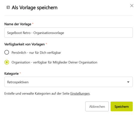 Wähle unter Verfügbarkeit von Vorlagen die Option „Organisation – verfügbar für Mitglieder Deiner Organisation“.