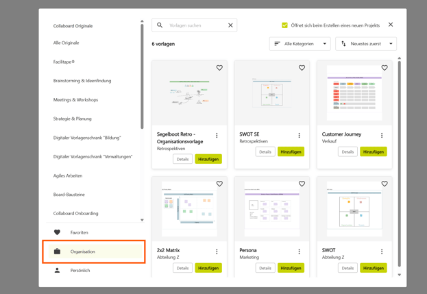 Mit Organisationsvorlagen kannst du Vorlagen erstellen, die allen Mitgliedern deiner Organisation zur Verfügung stehen. Diese Funktion ist besonders hilfreich, um standardisierte Workshops, Meeting-Formate oder Arbeitsprozesse für dein gesamtes Team bereitzustellen.