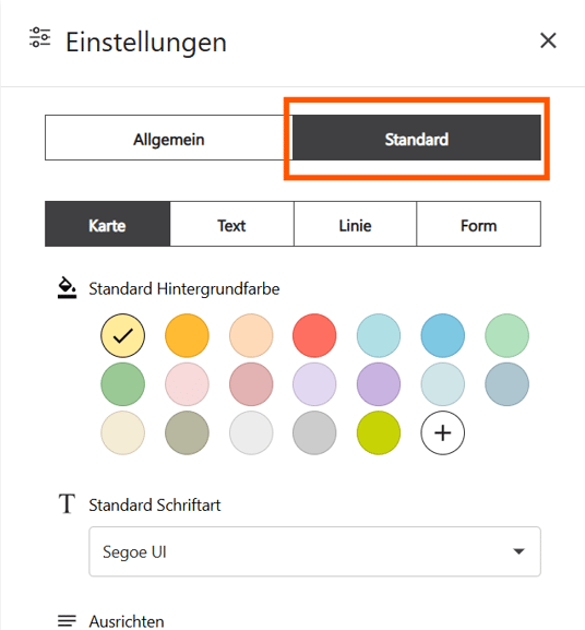 Die Standardeinstellungen ermöglichen es Dir, grundlegende Eigenschaften für Objekte auf dem Whiteboard vorab zu definieren – damit Du konsistent und effizient arbeiten kannst.