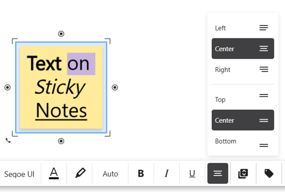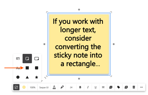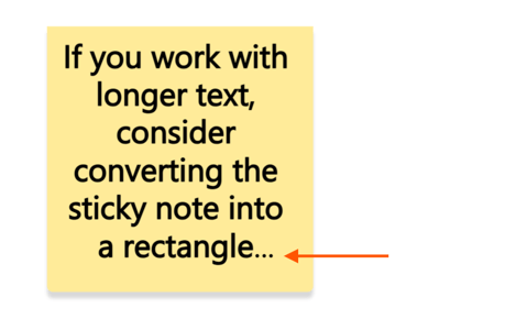 If you work with longer text, consider converting the sticky note into a rectangle shape. This provides more space and a better editing experience. Rectangle shapes can also have a background color, similar to sticky notes.